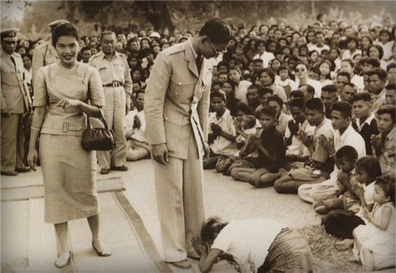 라마 9세 고 푸미폰 국왕과 시리낏 왕비가 태국 동북부 컨깬 지역을 행차했을 당시 지역 주민이 국왕에 엎드려 절하는 모습